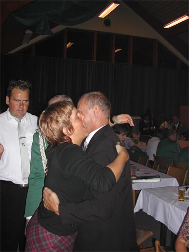 Am Sonntagmorgen hatten zwei Schützenbrüder auf dem Stadtbundkönigsfest Geburtstag. Auf dem Foto wird Theo Giesen gerade von der Königin der St. Antonius-Schützen-Gilde (Männ), Melanie Ursino, gratuliert.