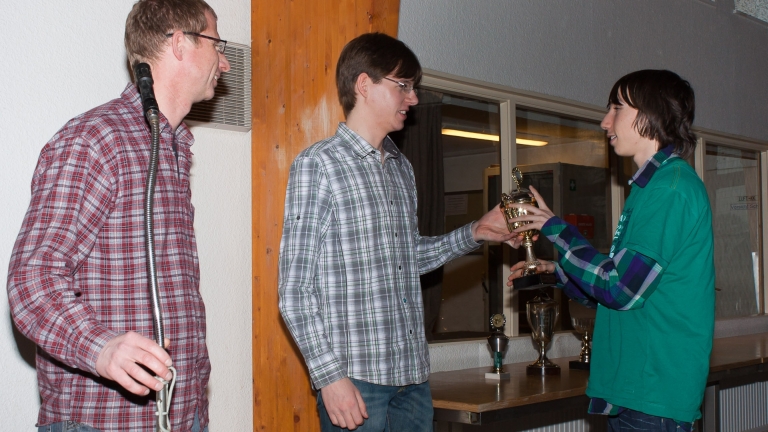 Tobias Humm holt den Wanderpokal der Klasse Schüler freistehend ab.