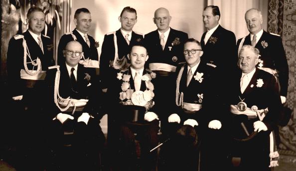 von Links, vordere Reihe: König Theo Langenberg, Adjutant Willi Maas, Präsident Johann Baldeau